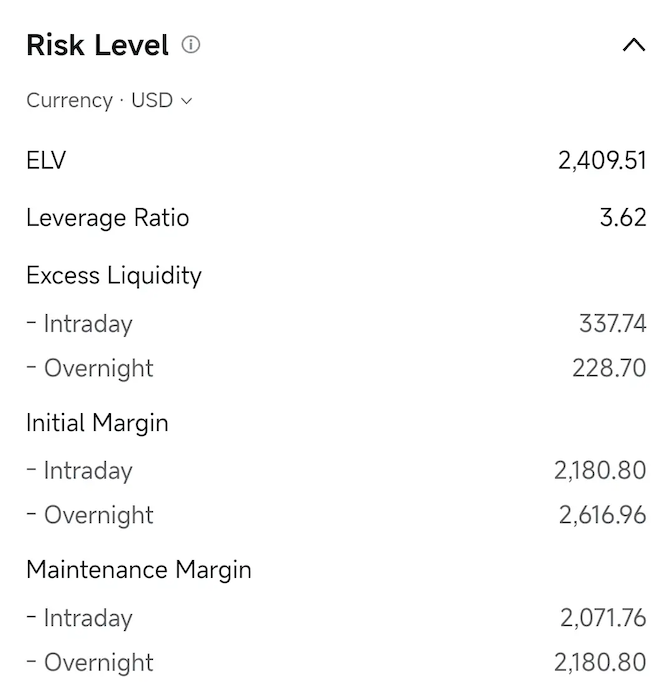 Function: This is an alert reference. It reflects your account's risk status without the Intraday Leverage Plus benefit. It helps you assess the feasibility of holding positions overnight in advance, avoiding liquidity issues or risk control triggers due to insufficient funds for overnight requirements.