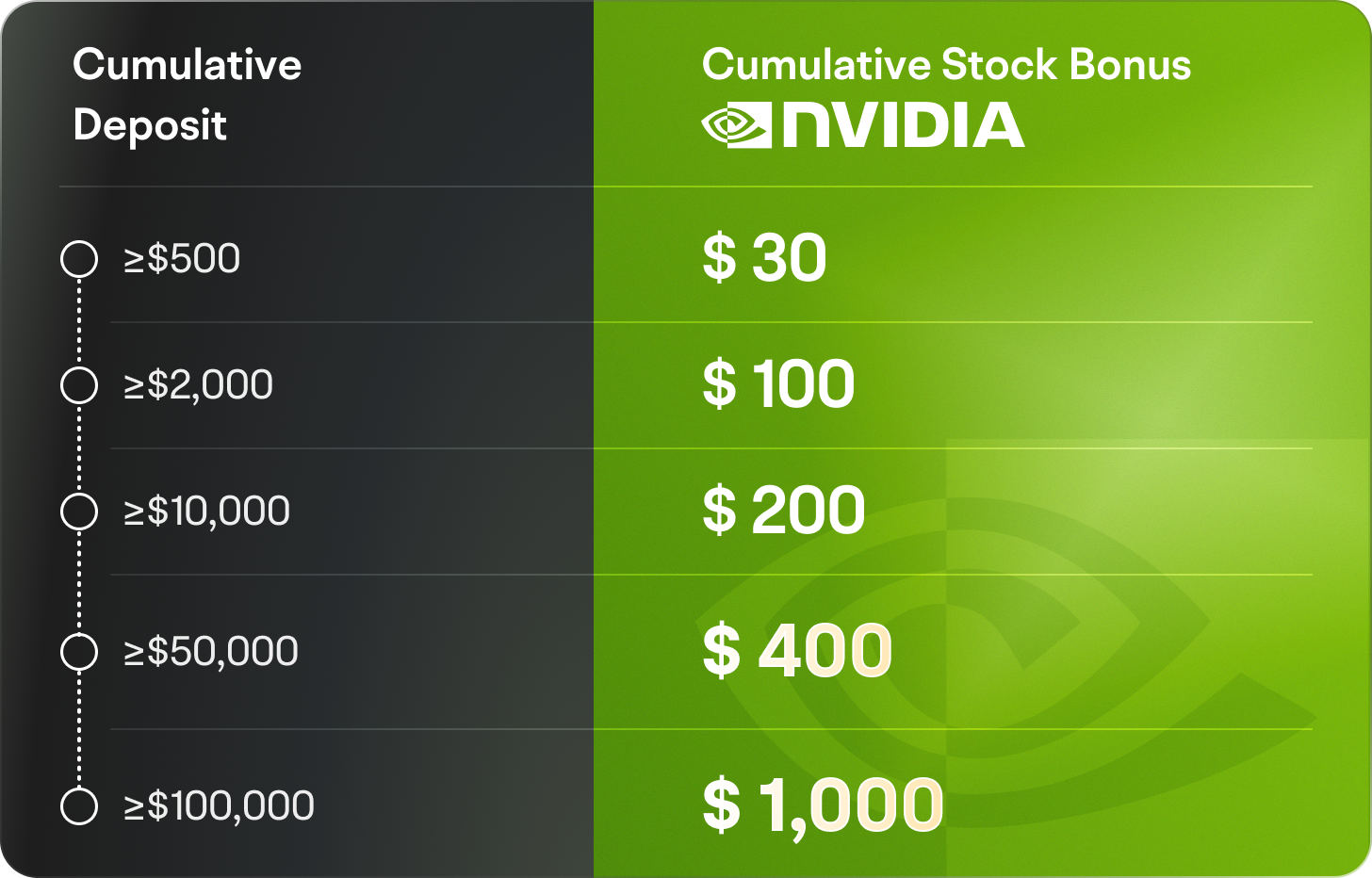 Step 1: Meet the promotion criteria. After you successfully receive free stocks during the promotion period, you will have to maintain a minimum asset balance of $100 for 60 days to unlock your $20 in NVDA stock, or to maintain a minimum asset balance of $2,000 for 60 days to unlock your $50 in NVDA stock,or to maintain a minimum asset balance of $10,000 for 60 days to unlock your $300 in NVDA stock, or to maintain a minimum asset balance of $50,000 for 60 days to unlock your $1,000 in NVDA stock. (Note: if you withdraw assets during the bonus freezing period resulting in your account equity falling below the bonus threshold, you will not be able to claim free stocks. If you have not withdrawn any assets during the freeze period, but your assets have decreased to less than the bonus threshold due to trading or price fluctuations in the market, you can contact customer service for help.)