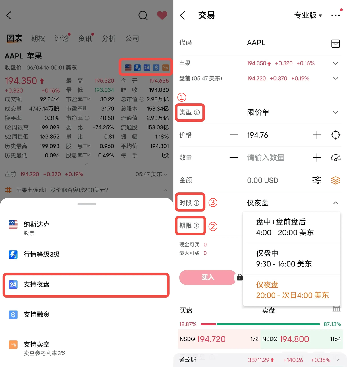 股票详情页小图标展示夜盘标识,则表明支持夜盘交易。