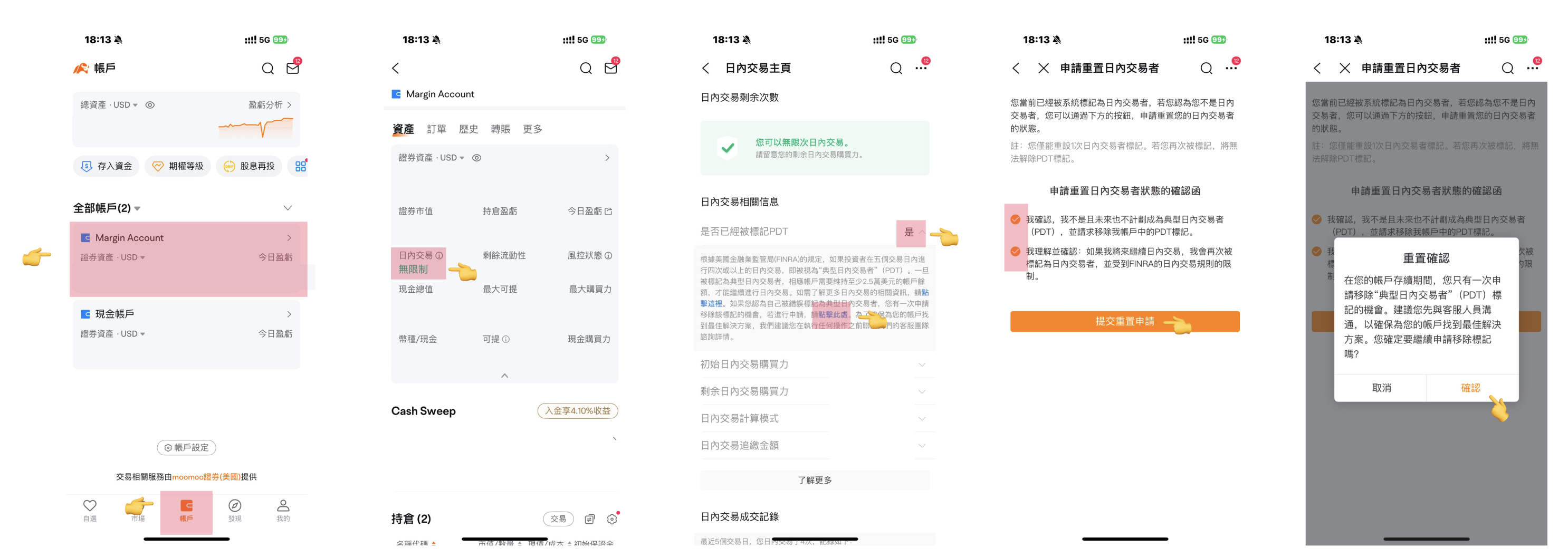 客戶可以通過以下途徑申請移除PDT標記:客戶端 → 在帳戶明細頁點擊"日內交易" → 點擊"是否已經被標記PDT" → 點擊"移除入口",進入移除申請頁 → 勾選選項並提交申請。